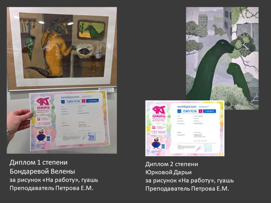 * 1 место — Бондарева Велена, преподаватель — Петрова Е. М.;
